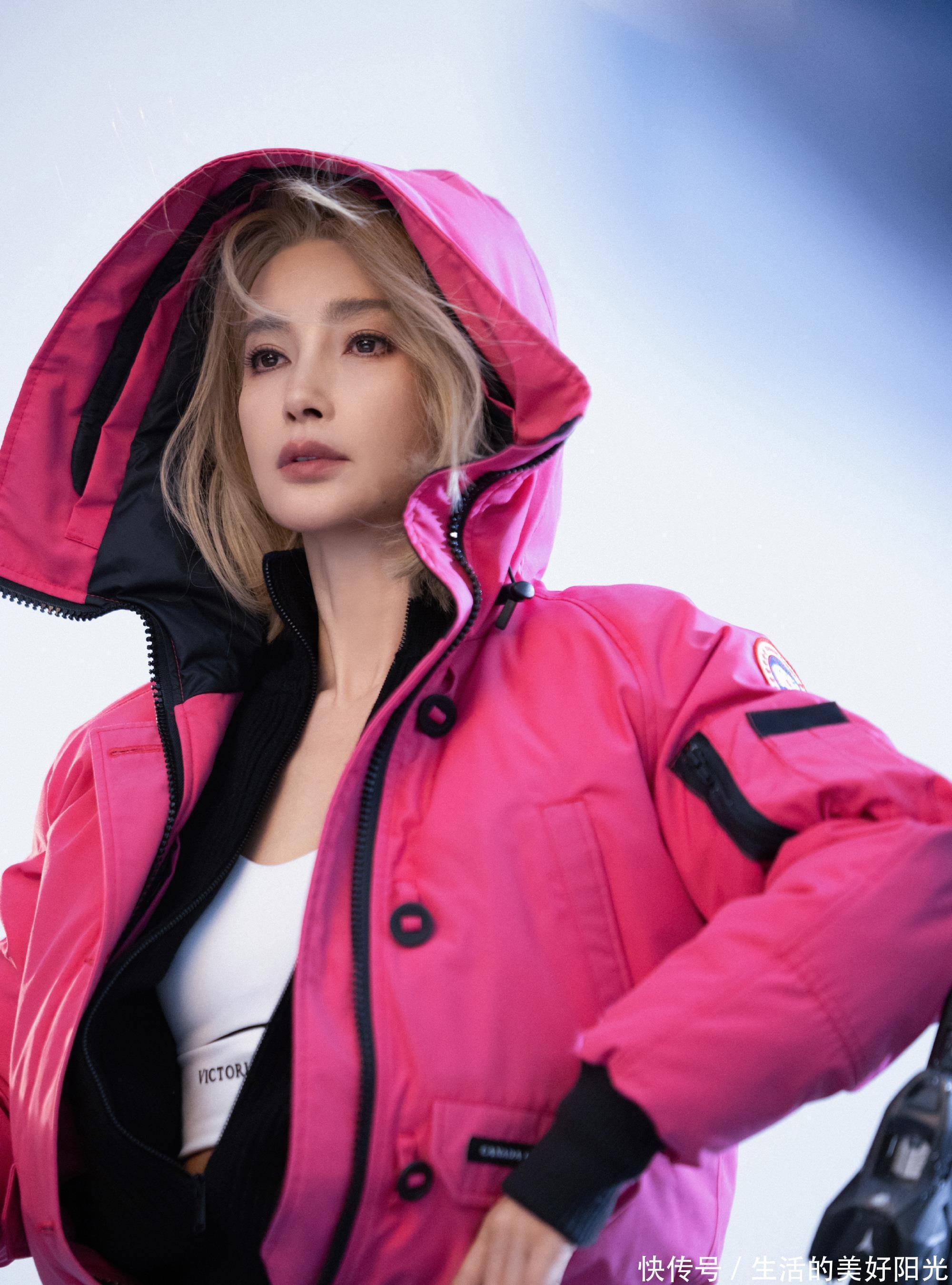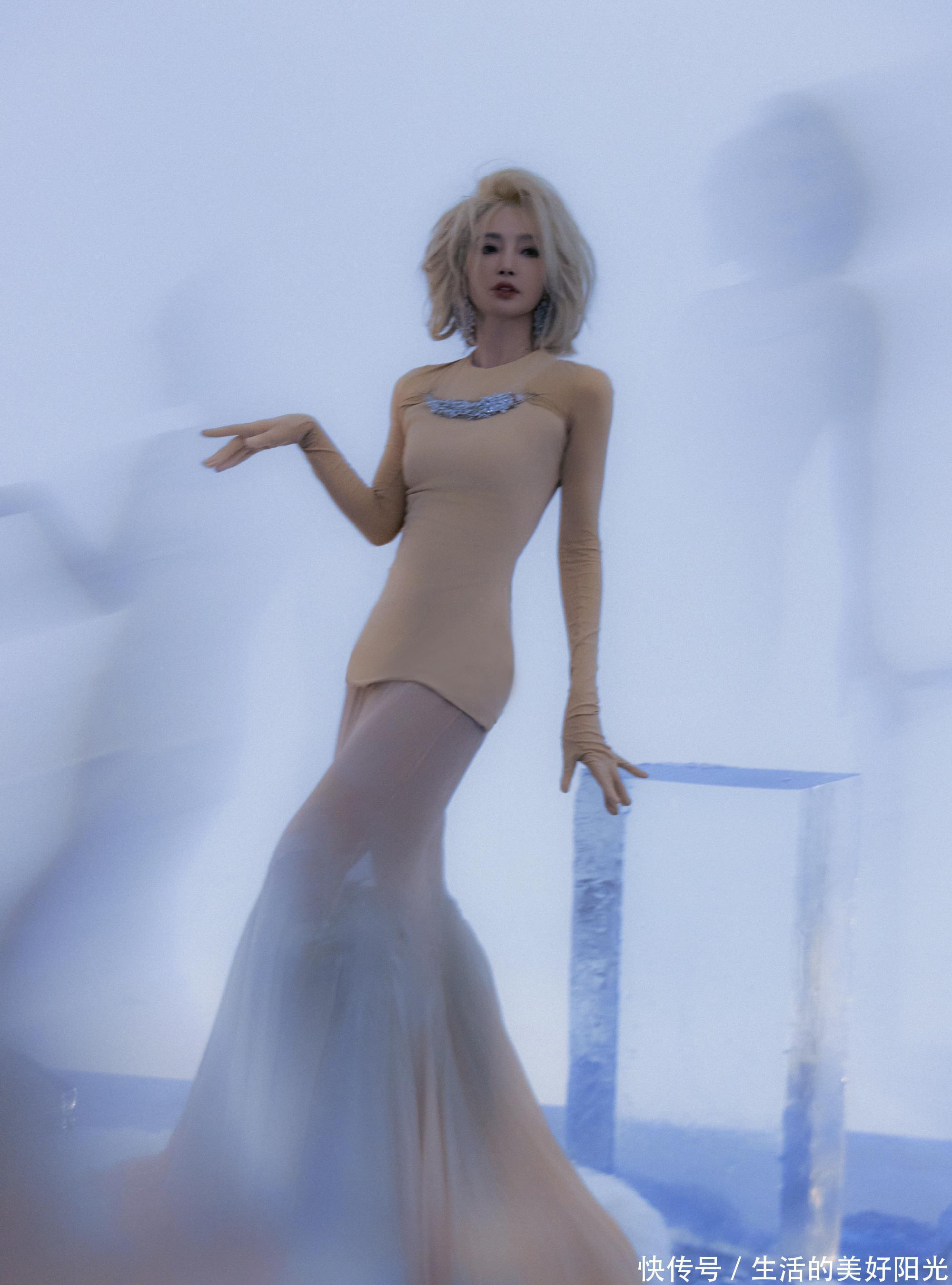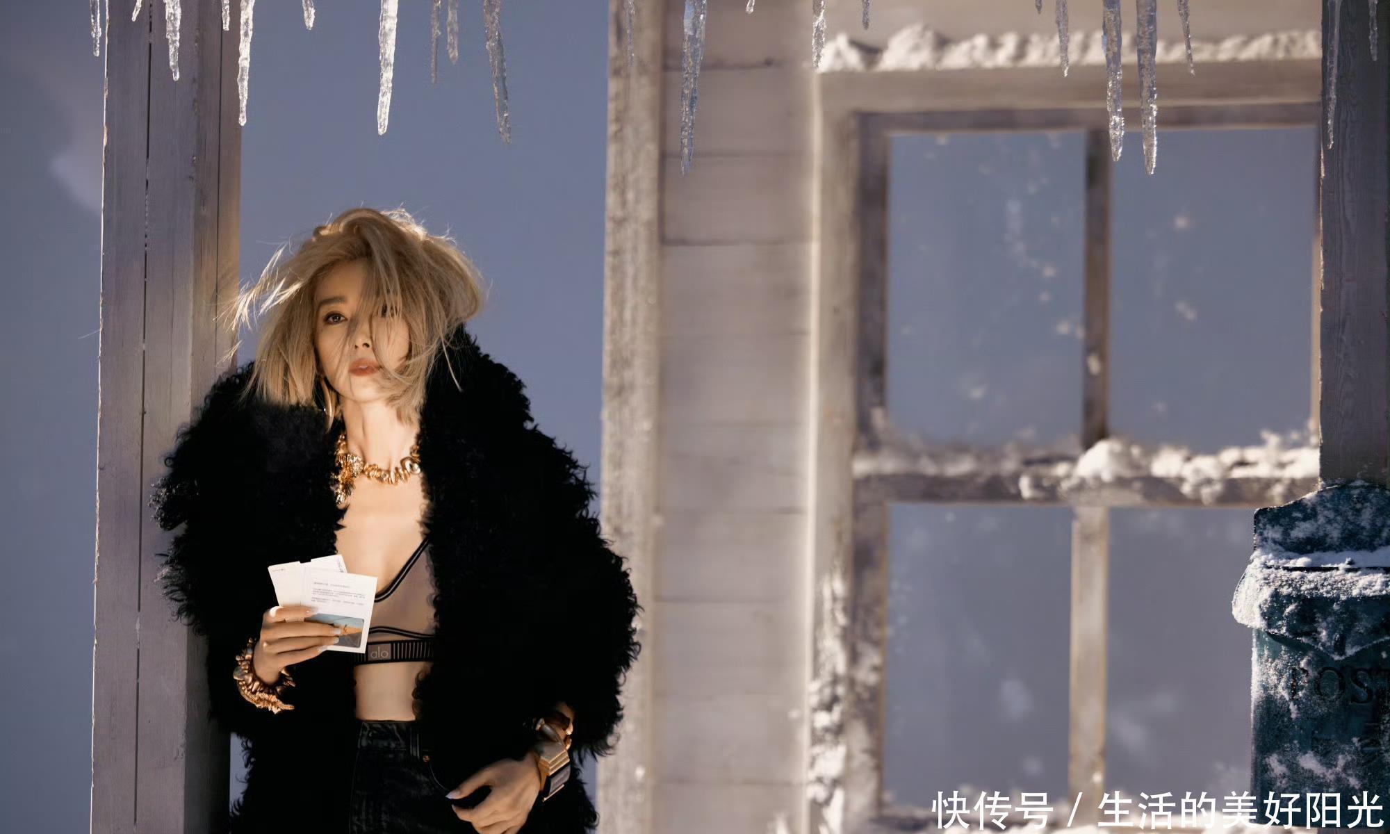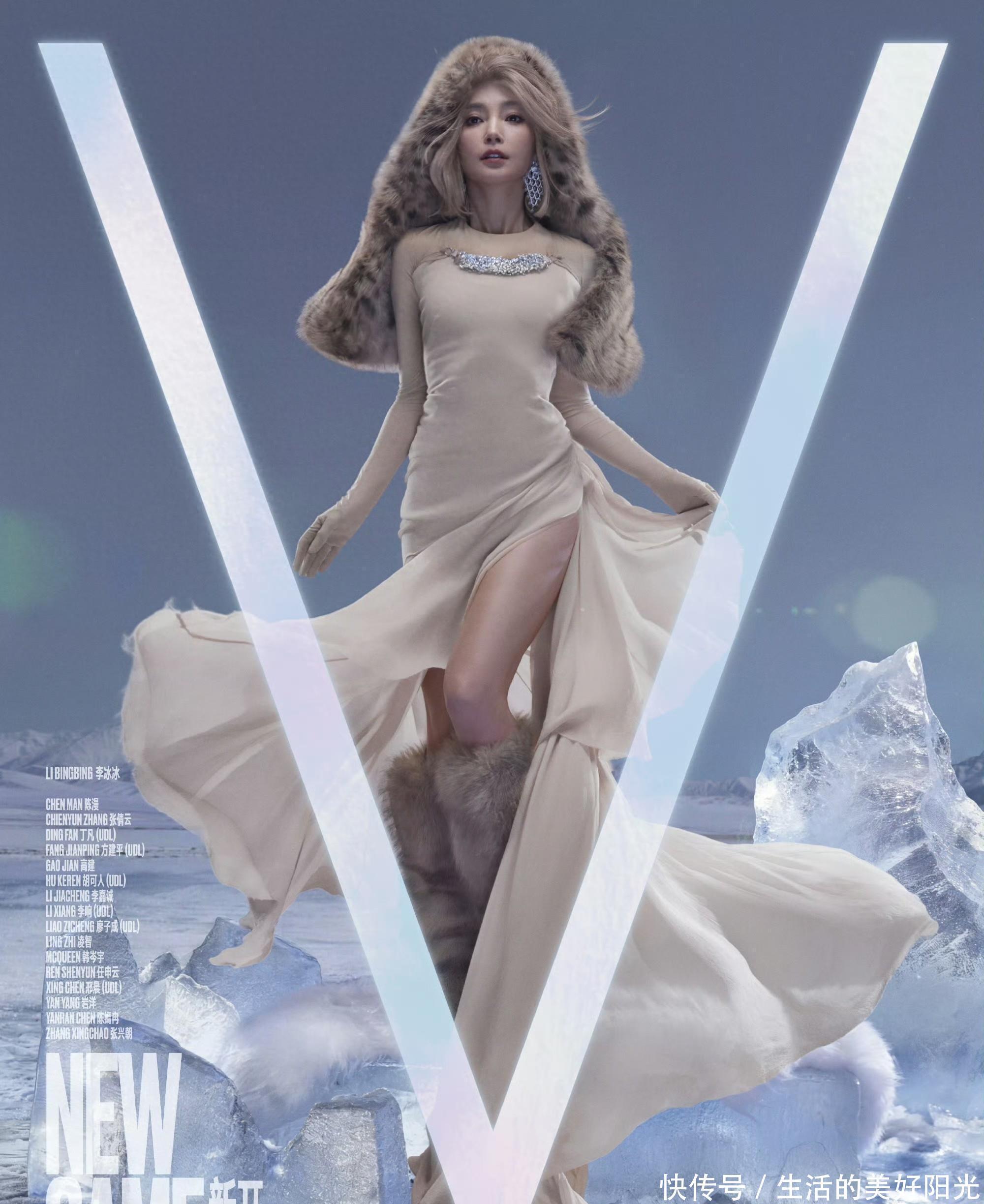 李冰冰身着浅米色高定礼裙,毛绒兜帽与皮草装饰尽显质感,钻石胸饰散发着奢华光泽。高开叉裙摆随风扬起,将她的身姿衬得曼妙大气,宛若冰雪幻境中走出的女王,在冰棱与冷光的映衬下,气场全开。