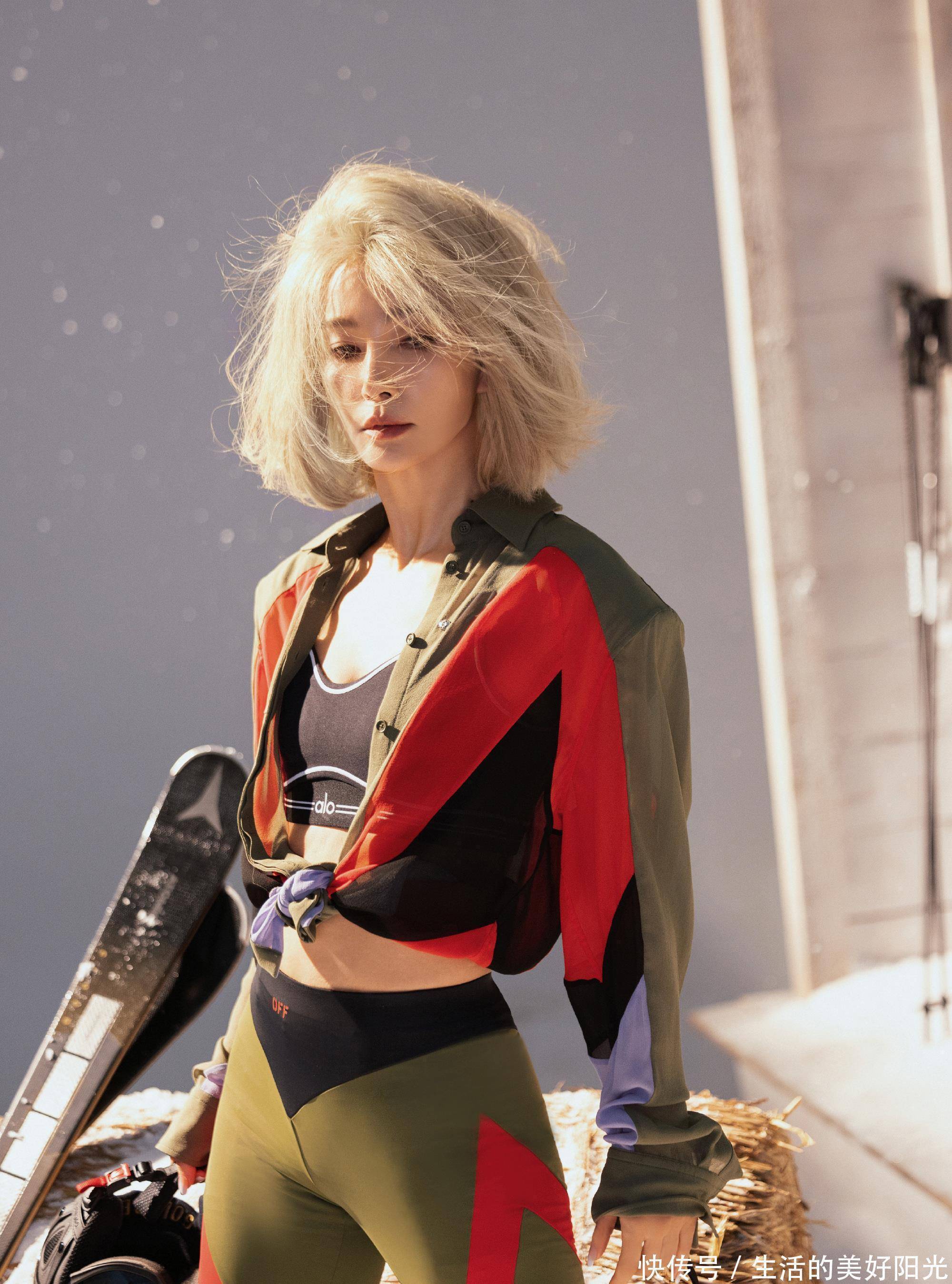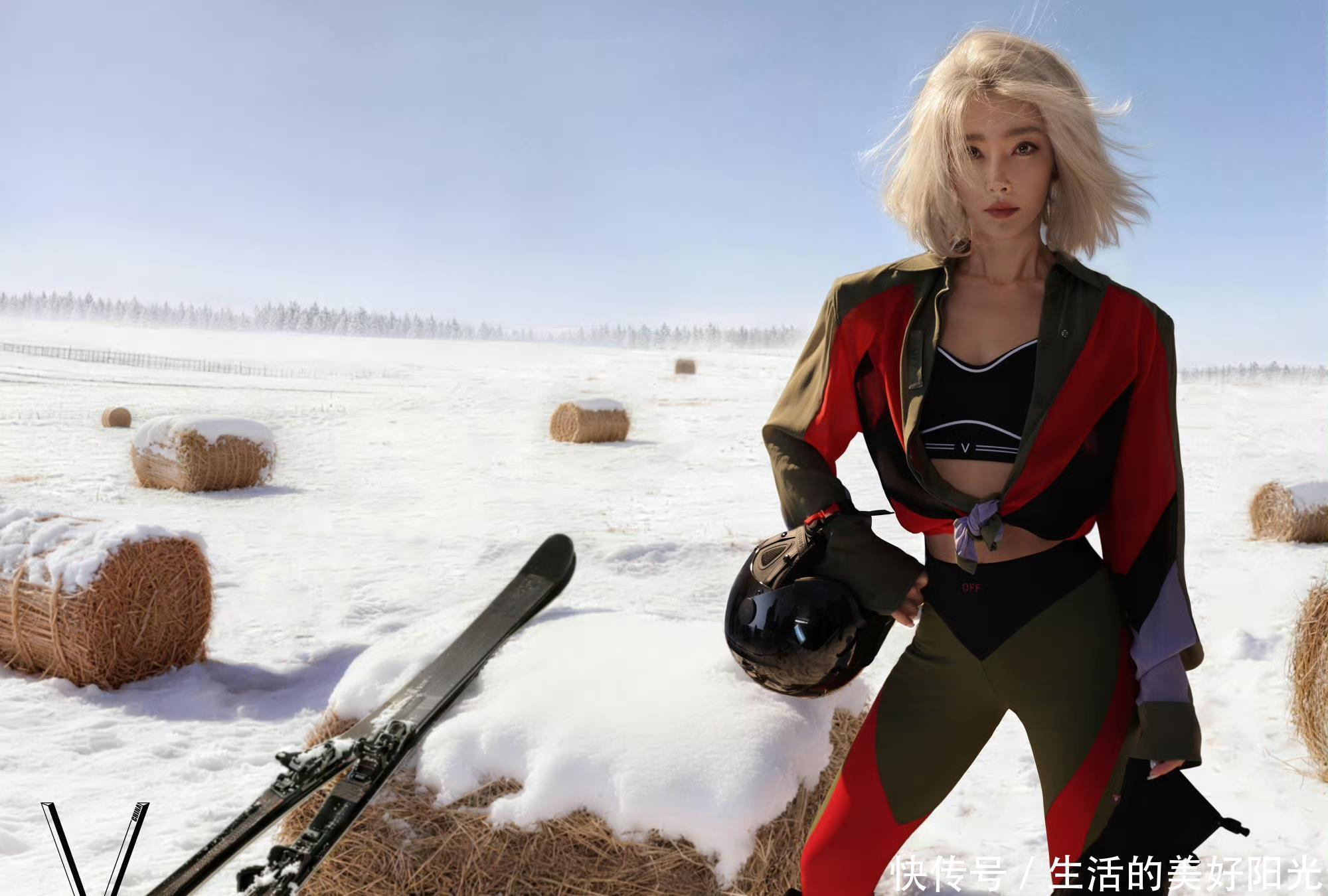 以红黑绿撞色户外套装打造酷飒的滑雪造型,宽松的工装版型混搭露腰内搭,硬朗与性感完美融合。她倚坐在草垛上,身旁滑雪板与皑皑雪山相映,金发被风雪吹起,野性洒脱的气质扑面而来。