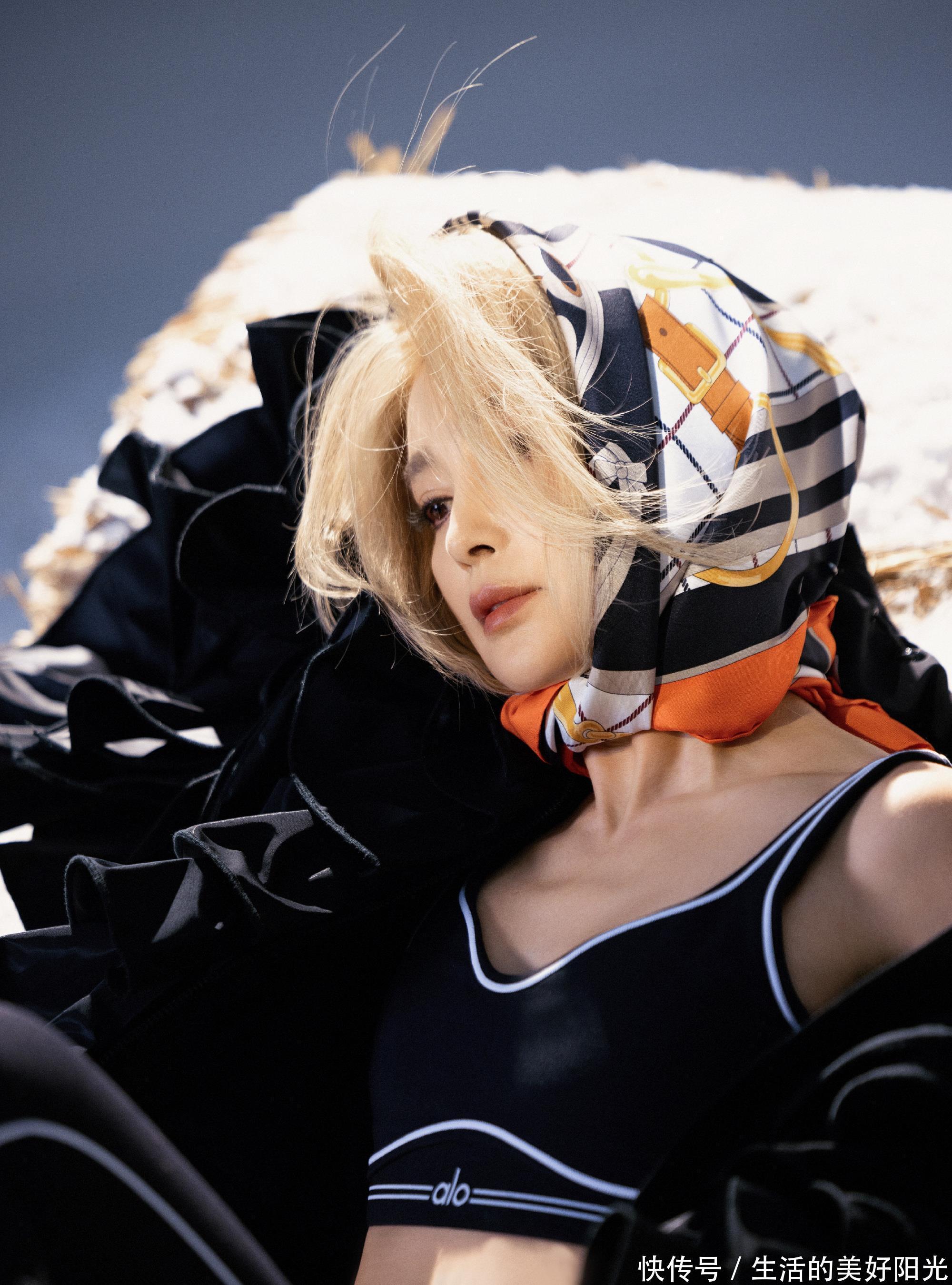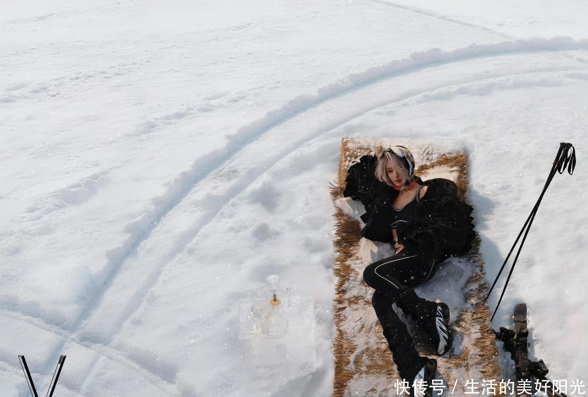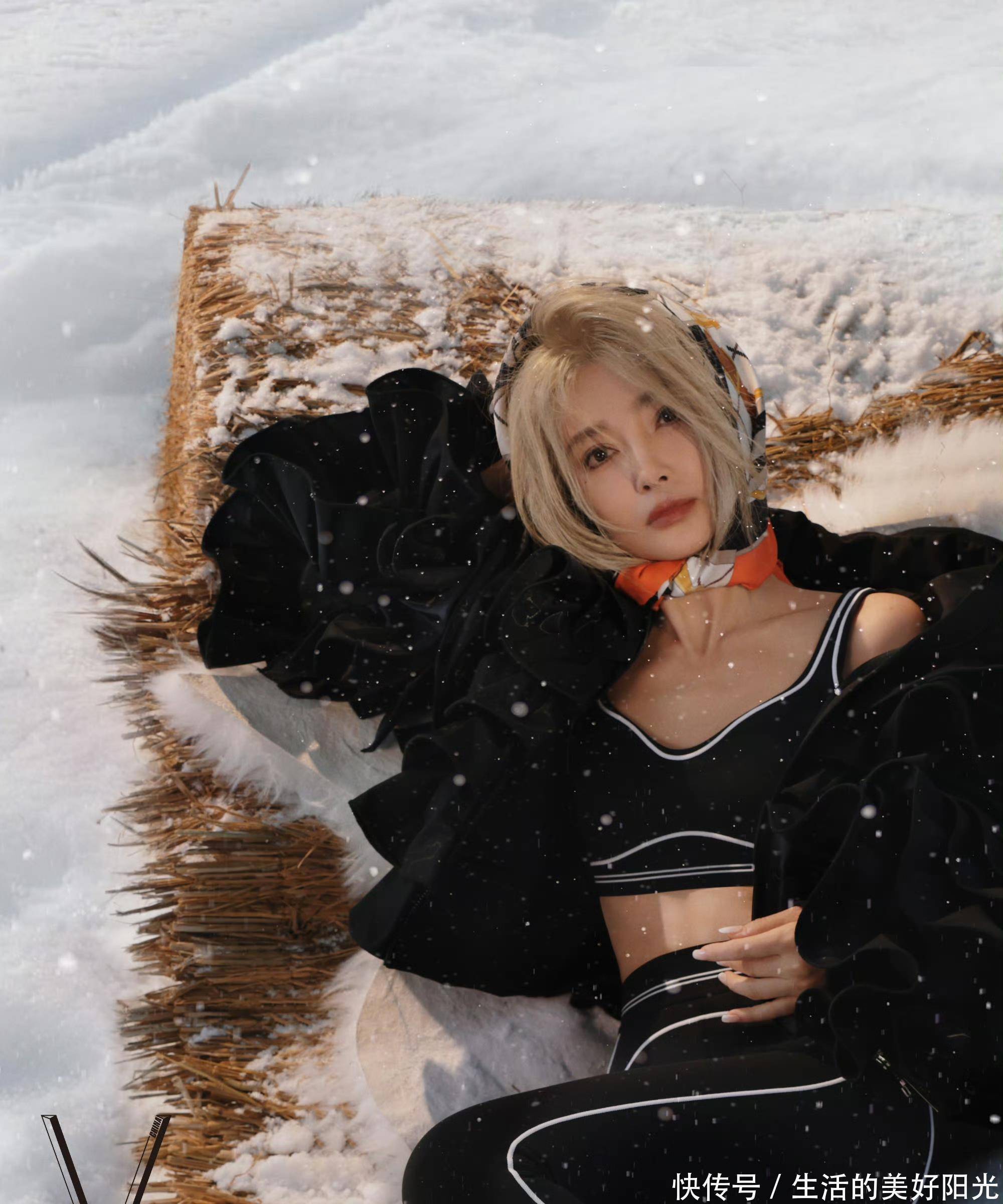 换上黑色运动套装,她躺靠在覆雪草垛旁,黑白线条衬出曼妙身形。撞色丝巾缠绕发间,明丽色块为暗调服饰点亮一抹鲜活。身侧的黑色褶皱纱料随意铺展,在冰雪天地间晕染出慵懒又高级的时尚图景。