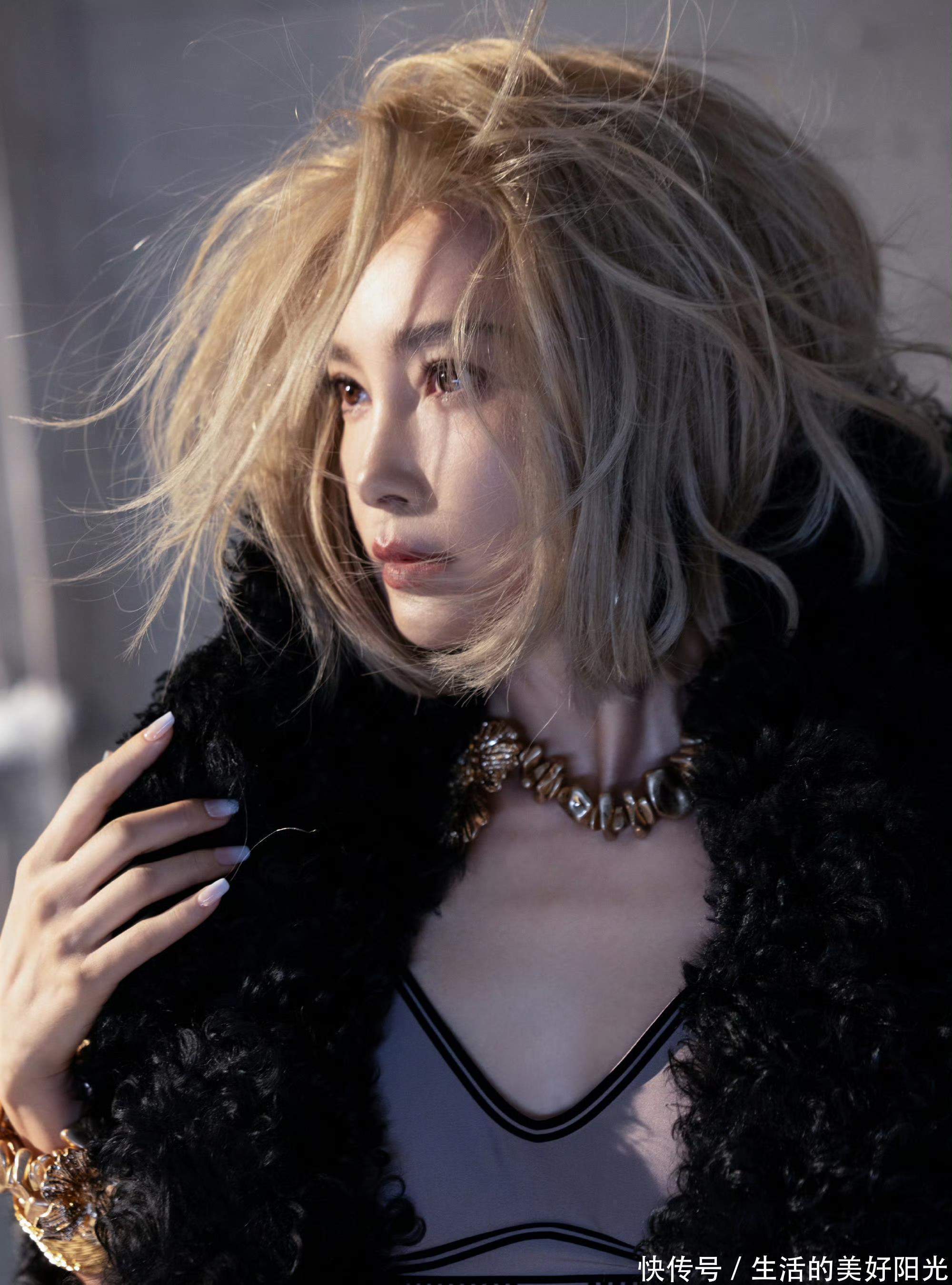 黑色毛绒大衣搭配灰色运动bra,柔软的黑绒质感与简约的运动内搭对比鲜明,颈间腕间的金饰在暗调中熠熠生辉。金发被风拂得凌乱卷曲,冷艳的眼神里透着神秘气场,暗黑奢华的风格在她身上自成一派。