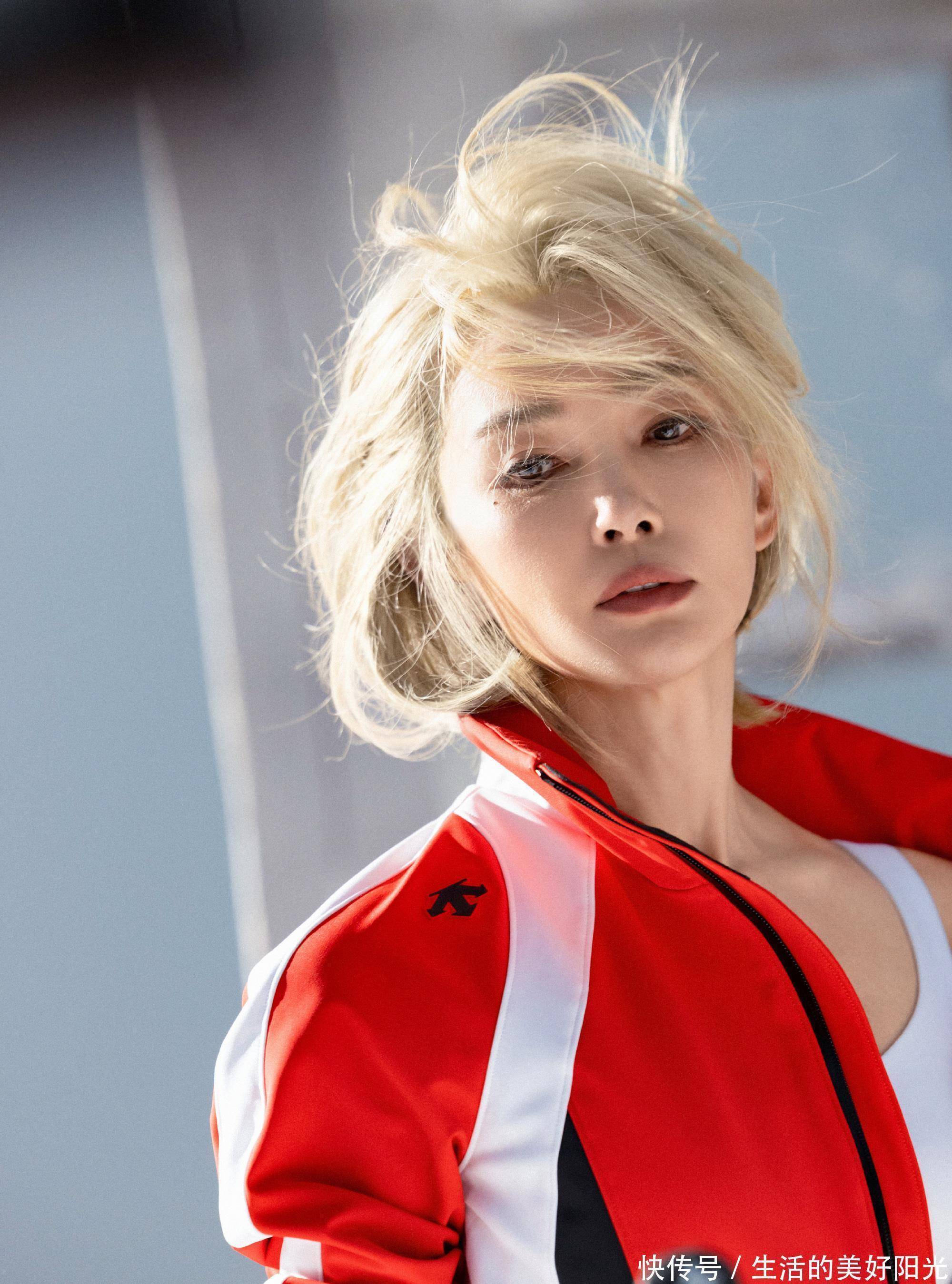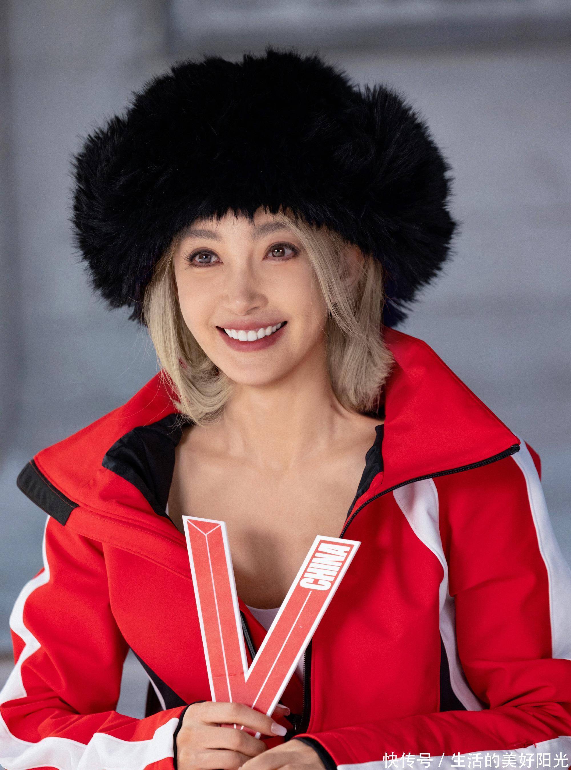 穿着红黑白拼色连体赛车服,单侧露肩设计打破了服装的规整感,露出优美的肩颈线条。她手持滑雪杖,金发凌乱愈发张扬,复古赛车风与冰雪元素碰撞出独特的摩登感,飒爽的姿态仿佛随时准备开启一场雪地竞速。